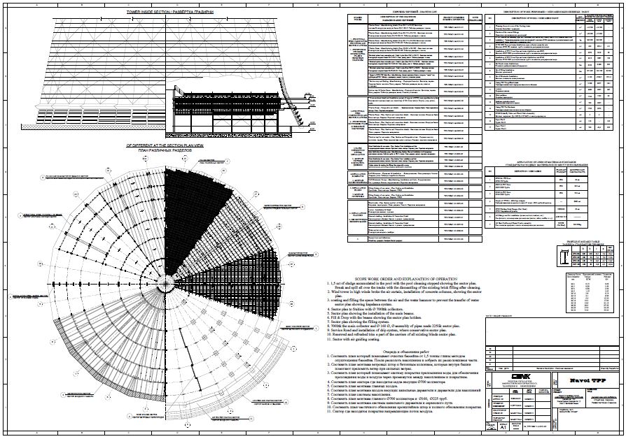 Башенную градирню целесообразно использовать на больших промышленных предприятиях. Площадь сечения башни должна занимать не менее 30—40% площади оросителя. Башни градирен средней и малой производительности могут иметь очень разнообразную форму: цилиндрическую, усеченного конуса или в виде усеченной многогранной пирамиды. Башенные градирни обычно выполняются в виде оболочек гиперболической формы, которая оптимальна по условиям внутренней аэродинамики и устойчивости.
